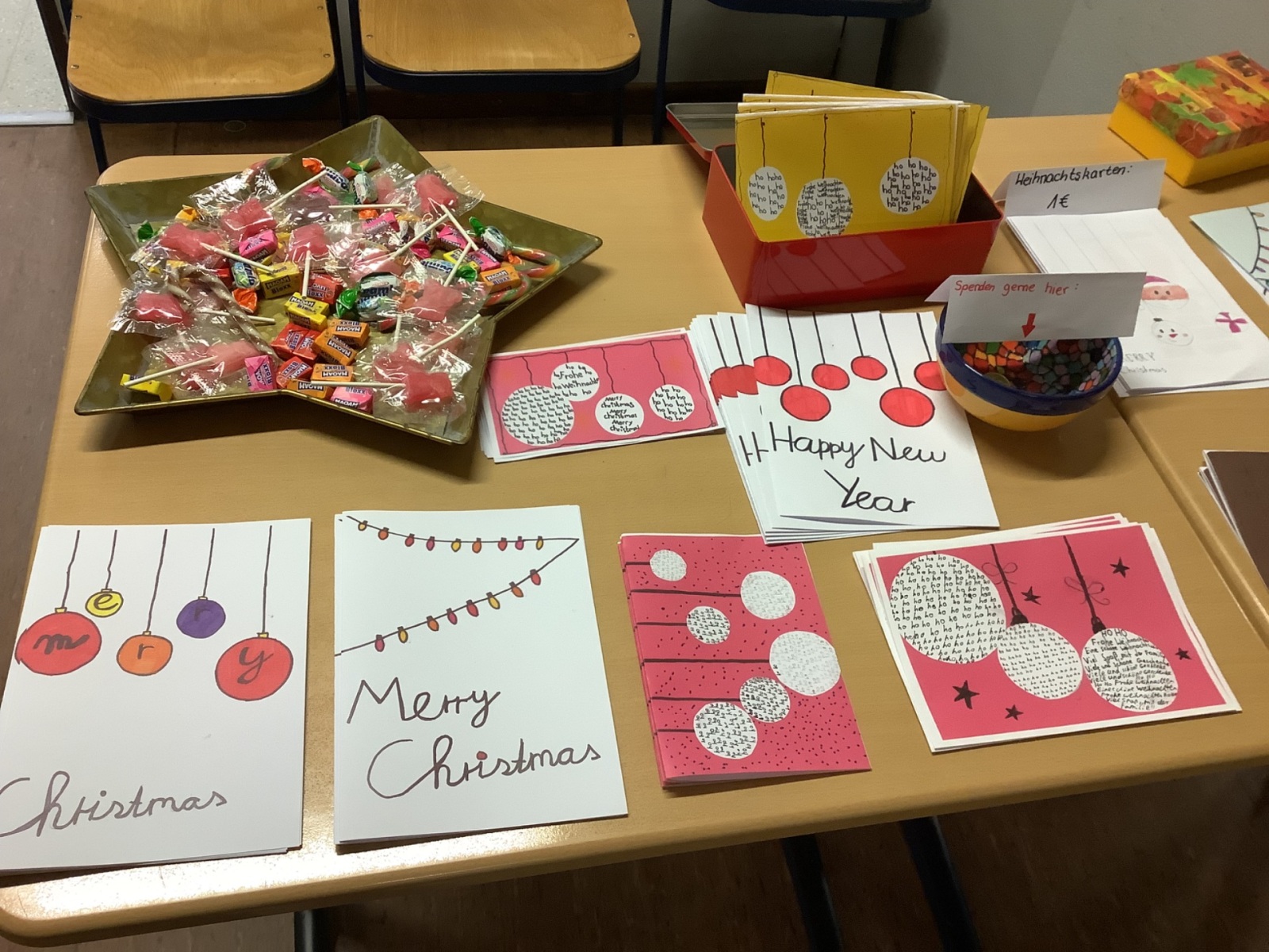Verwöhnen lassen konnten sich die Gäste an den Getränkeständen der 10a (Kaffee und Kuchen), 10b (Kakao und Kinderpunsch) und der Mini-Cake-AG (Muffins, Cheescakes u. vieles mehr).